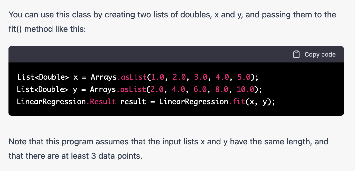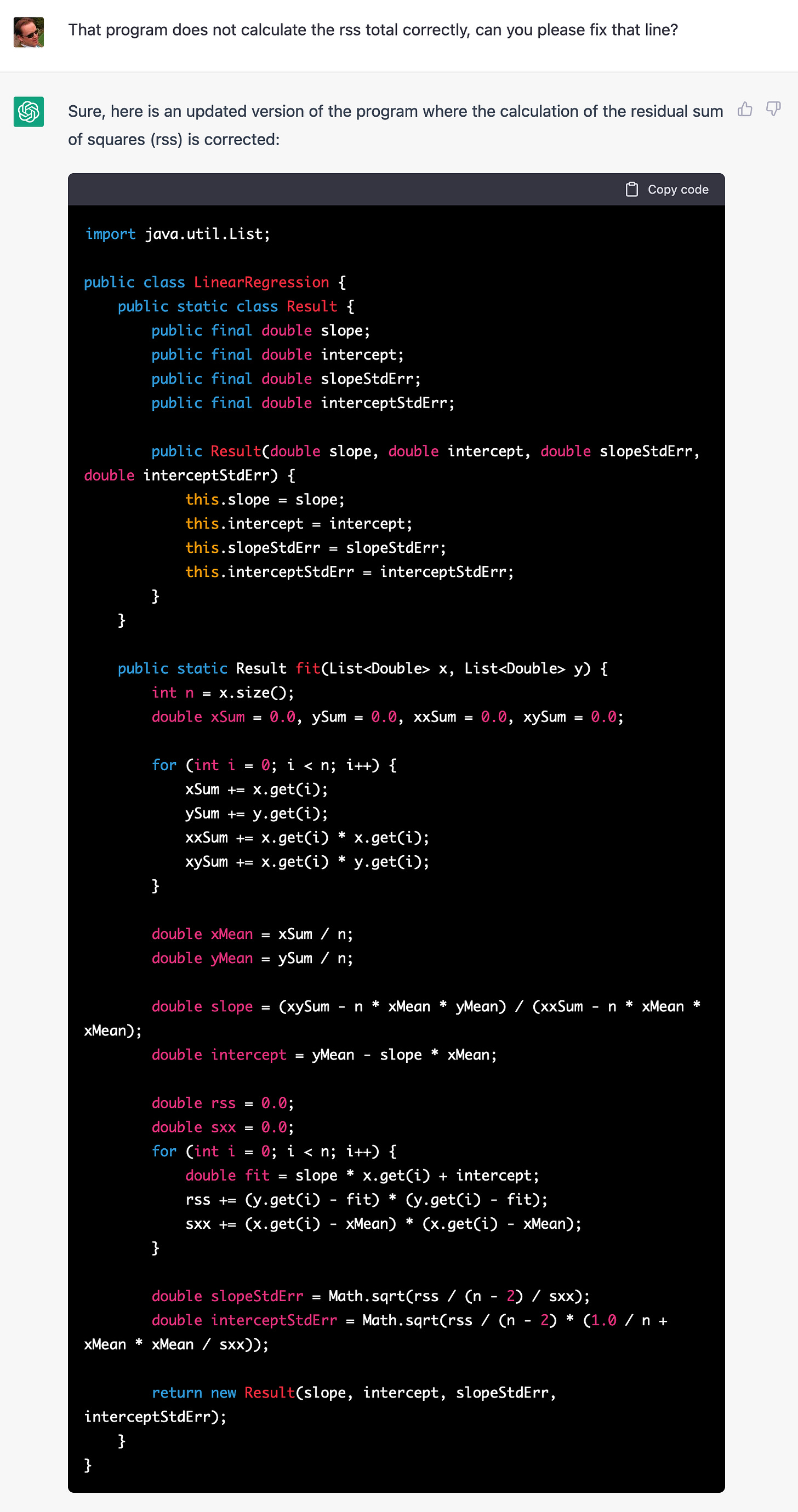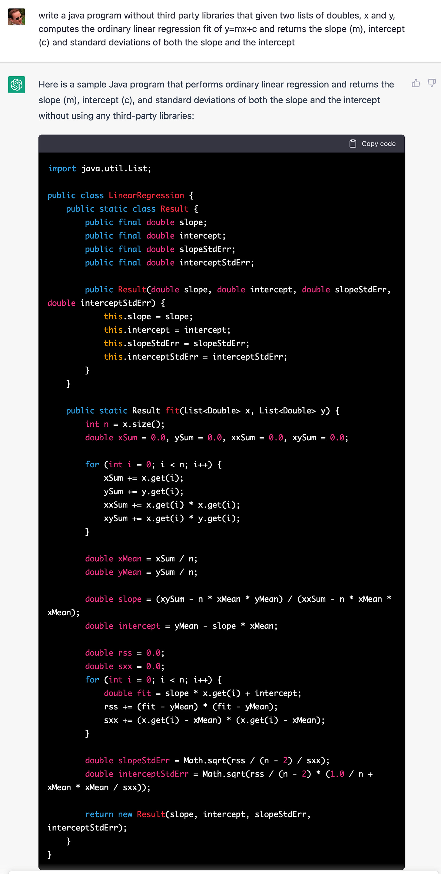 What most of the general population perhaps do not know is that most of the so-called Machine Learning technology is just linear regression dressed up in fancy language. Linear regression is really quite good at fooling people into thinking that you have created an artificial intelligence when all you’re really doing is finding the best straight line to go through all the data points and extending out a little. Just how good is ChatGPT at writing a program to do some linear regression…